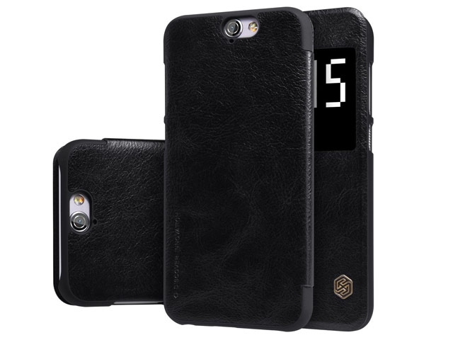 Черный кожаный чехол боковая книжка Nillkin Qin leather case для смартфона HTC One A9 (с прорезями для динамиков в крышке)