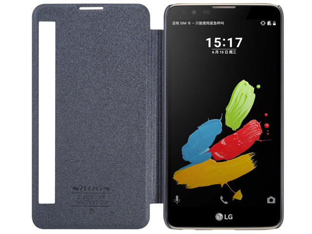 Темно-серый чехол-книжка Nillkin Sparkle Leather Case для смартфона LG Stylus 2: боковая книжка с прорезями для динамика и окошком для просмотра номера звонящего, материал - винилискожа