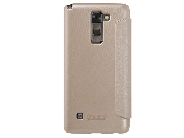 Золотистый чехол-книжка Nillkin Sparkle Leather Case для смартфона LG Stylus 2: боковая книжка с прорезями для динамика и окошком для просмотра номера звонящего, материал - винилискожа