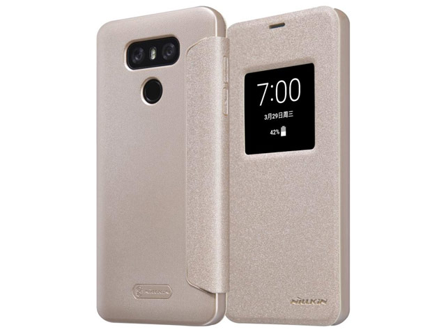 Золотистый чехол-книжка Nillkin Sparkle Leather Case для смартфона LG G6: боковая книжка с окошком и прорезями для динамика в крышке, материал - винилискожа