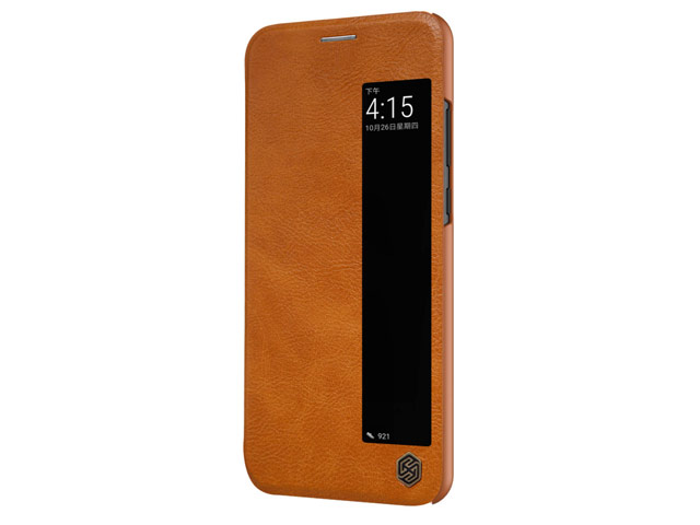 Коричневый кожаный чехол боковая книжка Nillkin Qin leather case для защиты смартфона Huawei P20 pro (с прорезями для динамиков в крышке)