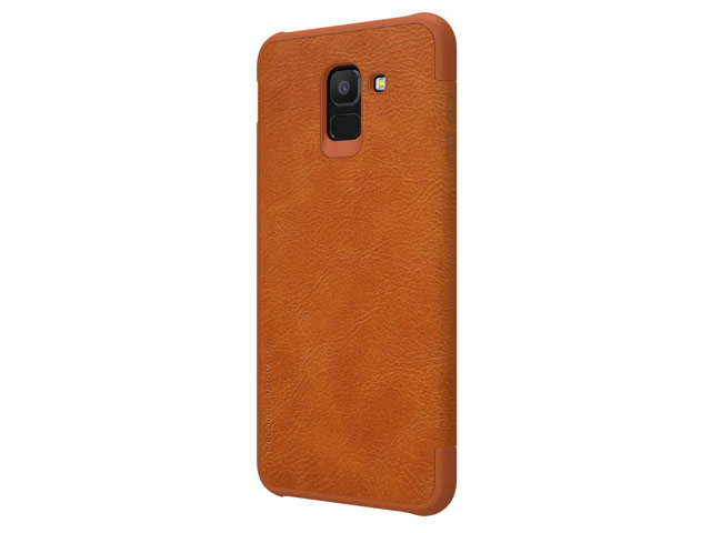 Коричневый кожаный чехол боковая книжка Nillkin Qin leather case для защиты смартфона Samsung Galaxy J6 (с прорезями для динамиков в крышке)