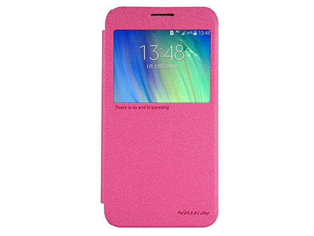 Розовый чехол-книжка Nillkin Sparkle Leather Case для смартфона Samsung Galaxy E7 SM-E700: боковая книжка с прорезями для динамика и окошком для просмотра номера звонящего, материал - винилискожа