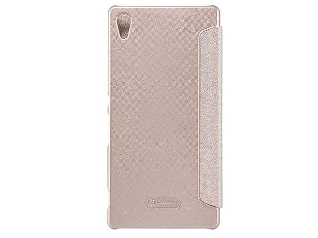 Золотистый чехол-книжка Nillkin Sparkle Leather Case для смартфона Sony Xperia Z4 (Z3 plus): боковая книжка с прорезями для динамика и окошком для просмотра номера звонящего, материал - винилискожа